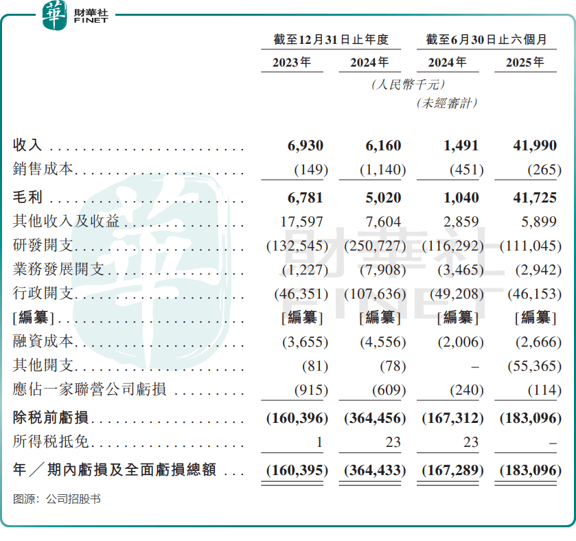 尽管产品管线前景广阔,但宝济药业当前的财务状况仍存在明显短板,盈利验证仍需跨越多重关卡。财务数据显示,公司2023年、2024年及2025年上半年收入分别为693万元、616万元及4199万元。