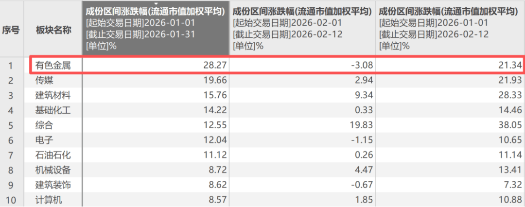 尽管进入2月以来板块有所波动,但截至2月12日,有色金属指数的年内累计涨幅依然达21%。