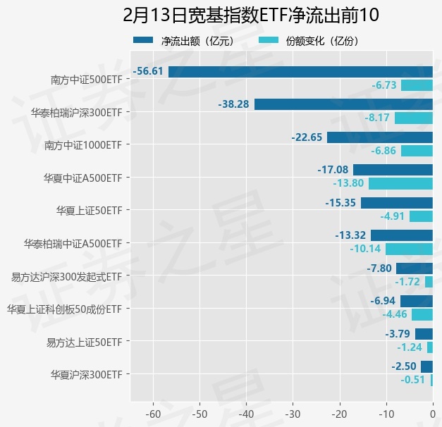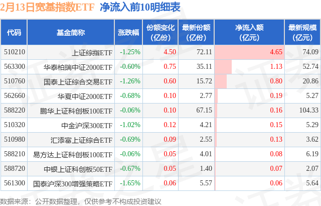 证券之星消息,2月13日宽基指数ETF基金合计资金净流出196.07亿元,近5个交易日累计净流出366.16亿元,5个交易日中出现日合计资金净流出的有4天(ETF资金流向计算公式:(当日ETF场内流通份额-前一交易日ETF场内流通份额)*当日ETF均价,计算结果仅供参考)。