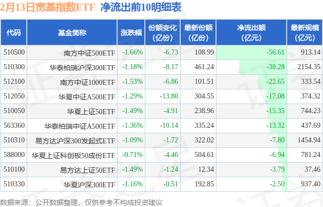 当日有89只宽基指数ETF基金出现资金净流出,其中净流出排首位的是南方中证500ETF(510500),份额减少了6.73亿份,净流出额为56.61亿元。