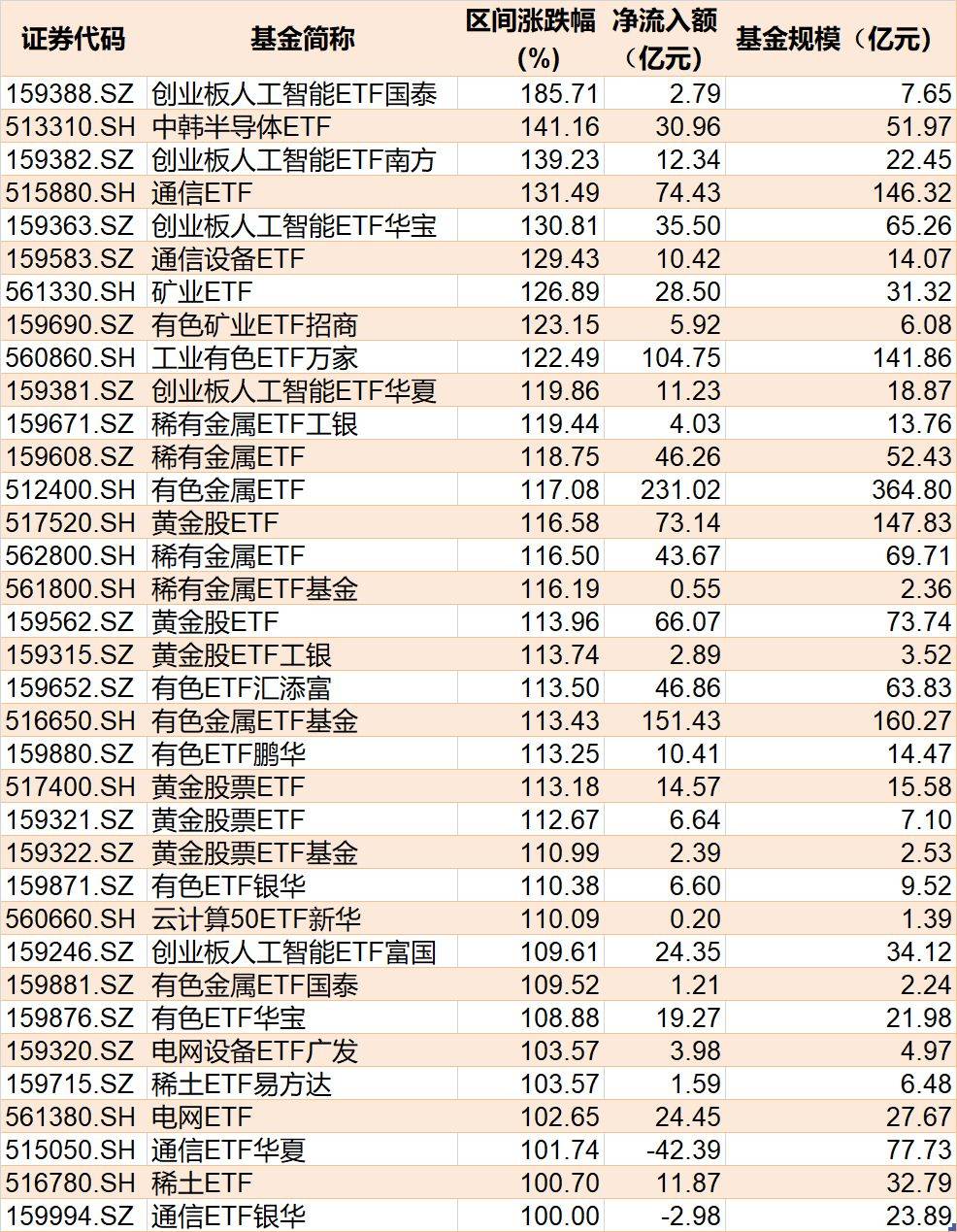Wind数据显示,蛇年有35只ETF涨幅超100%,其中涨幅前三的ETF分别为创业板人工智能ETF国泰、中韩半导体ETF、创业板人工智能ETF南方,分别累计上涨了185.71%、141.16%、139.23%。