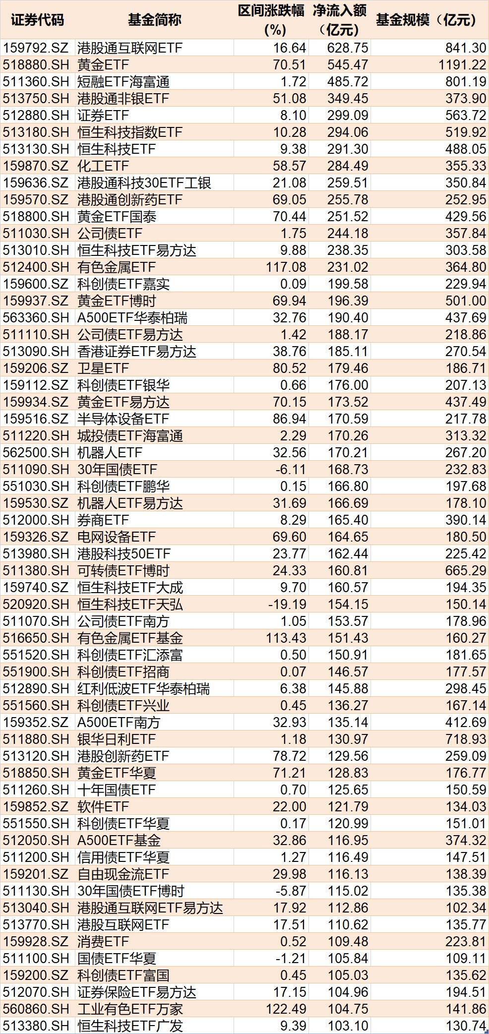具体来看,蛇年净流入资金超100亿元的ETF有59只,其中港股通互联网ETF、黄金ETF、短融ETF海富通分别净流入资金628.75亿元、545.47亿元和485.72亿元。