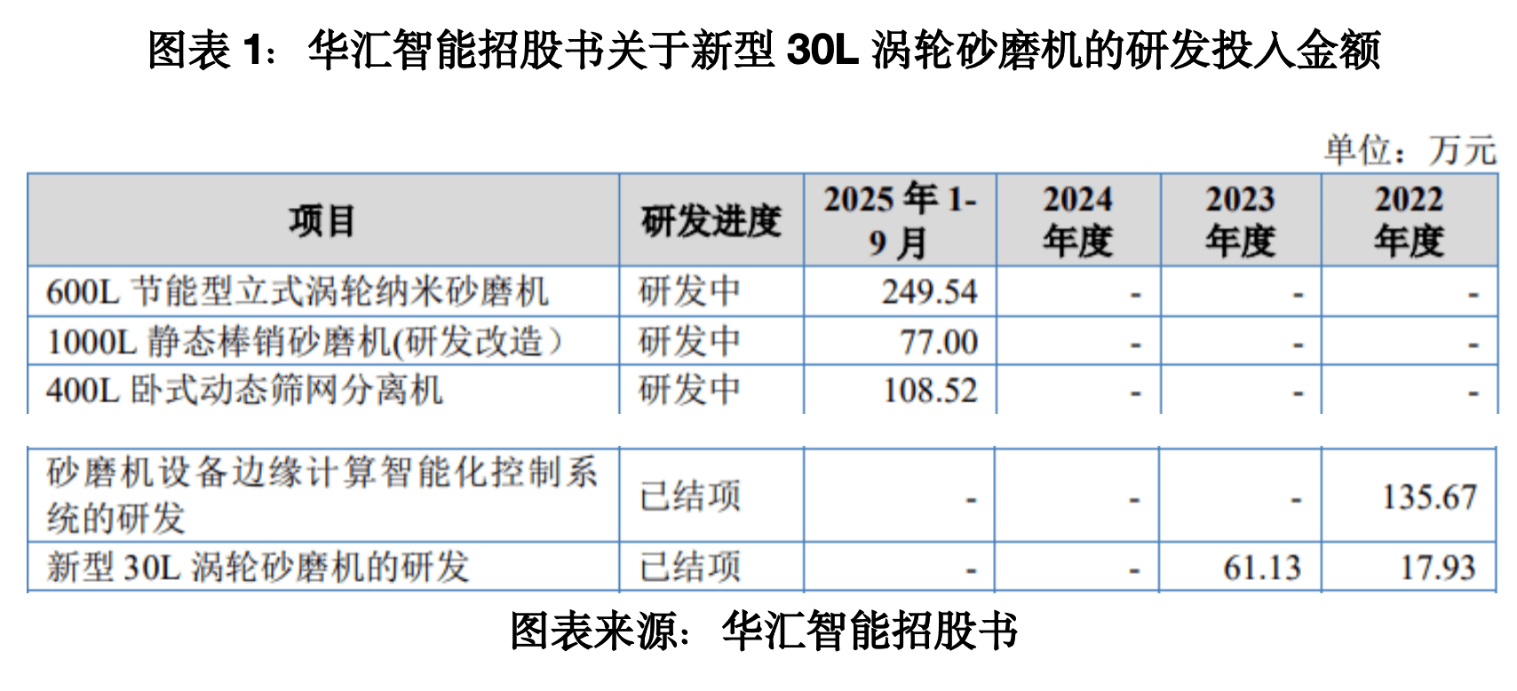 招股书显示,2022—2023年,华汇智能“新型30L涡轮砂磨机”的研发投入金额分别为17.93万元、61.13万元且已结项,且在招股书中,华汇智能表示,报告期内(2022—2025年前三季度),公司研发投入全部计入研发费用,不存在研发支出资本化的情形。