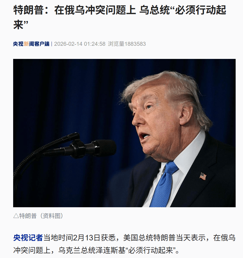 央视记者当地时间2月13日获悉,美国总统特朗普当天表示,在俄乌冲突问题上,乌克兰总统泽连斯基“必须行动起来”。
