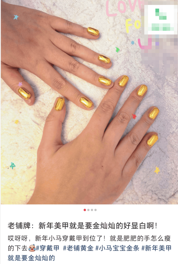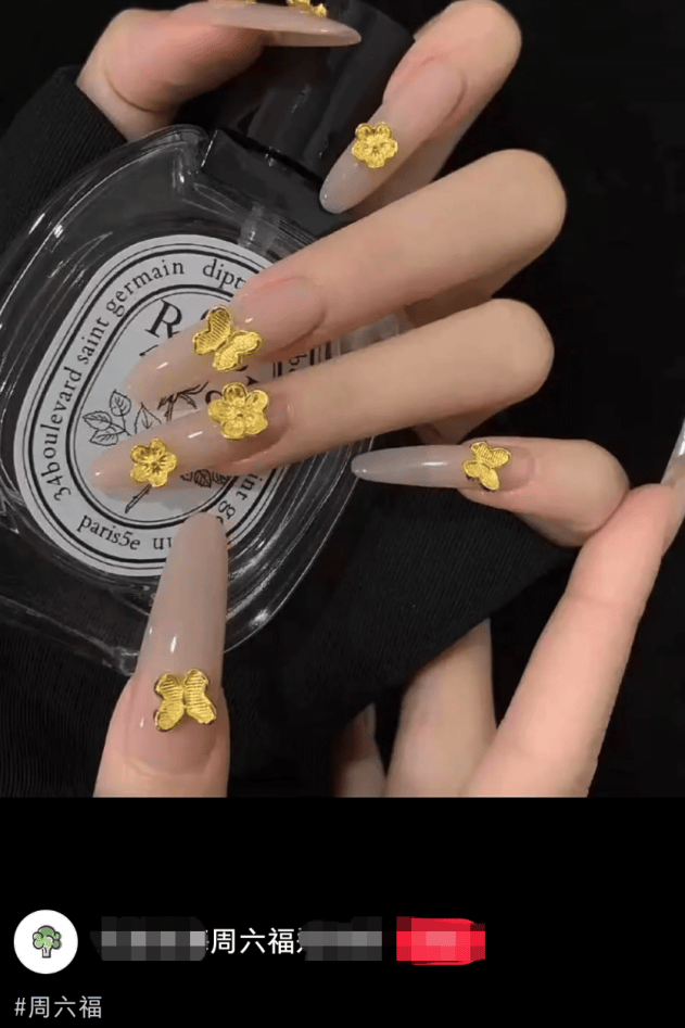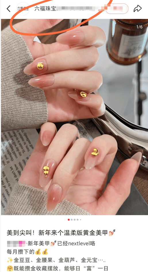 当前,如六福珠宝、周六福等品牌店铺的店员,也将金饰用于美甲“宣传”,在社交媒体进行营销。