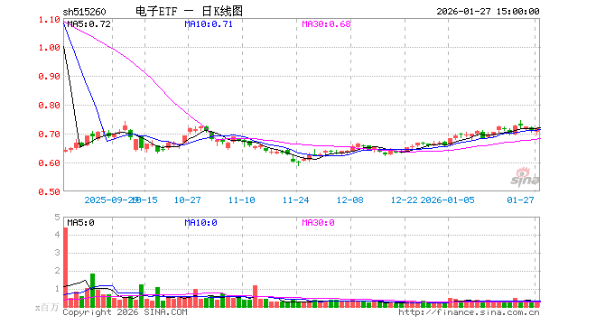 1月27日,电子ETF(515260)涨0.85%,成交额1732.60万元。当日份额减少200.00万份,最新份额为8.55亿份,近20个交易日份额减少4200.00万份。最新资产净值计算值为6.11亿元。