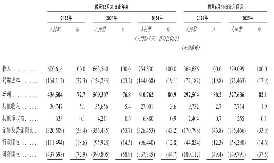 招股书显示,群核科技2022年、2023年、2024年营收分别为6亿元、6.64亿元、7.55亿元;毛利分别为4.37亿元、5.09亿元、6.1亿元;毛利率分别为72.7%、76.8%、80.9%。