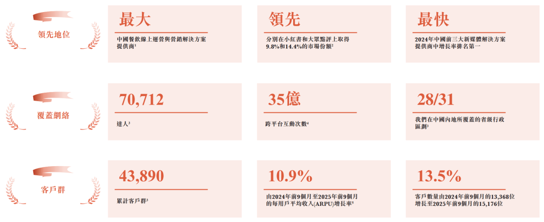 截至2025年9月30日,公司与大众点评、抖音平台及通过第三方代理机构的超过70,000位达人合作,截至2025年9月30日止九个月,公司赋能在小红书、抖音及大众点评等平台上约464,410条帖子及视频的创作,累计产生逾35亿次互动。
