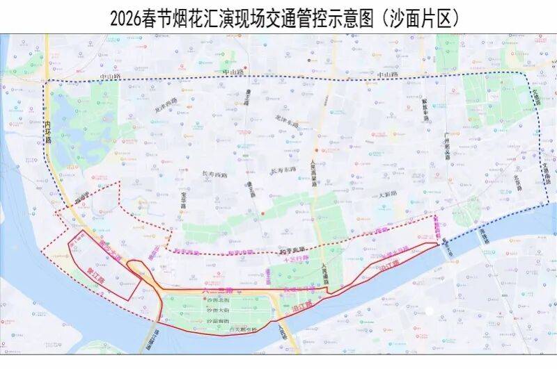 2月17日15:00至活动结束,对黄沙大道(不含,华誉一街路口至御景1号门口段)、誉江路、华誉一街合围区域,人民桥东西侧便道(西堤二马路至沿江西路)、新基路、靖远路、新堤三横路、新堤一横路、沿江路(解放路至白天鹅宾馆引桥口)等区域(路段)实施临时交通管理措施。