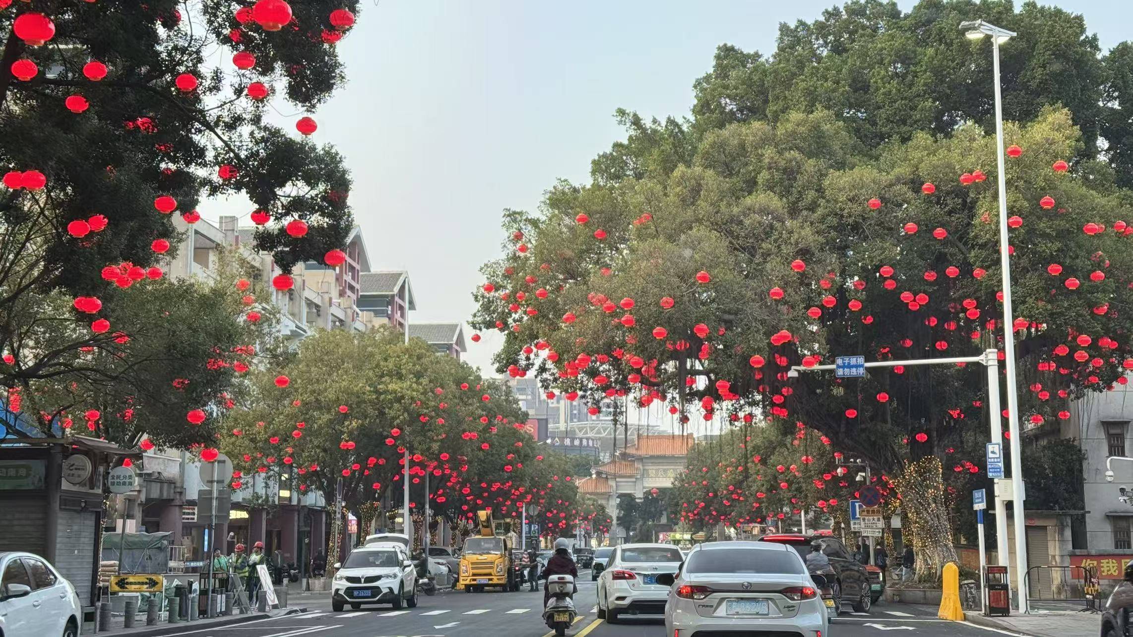 西樵登山大道焕然一新,崭新路面平整畅行,大红灯笼高高挂起。