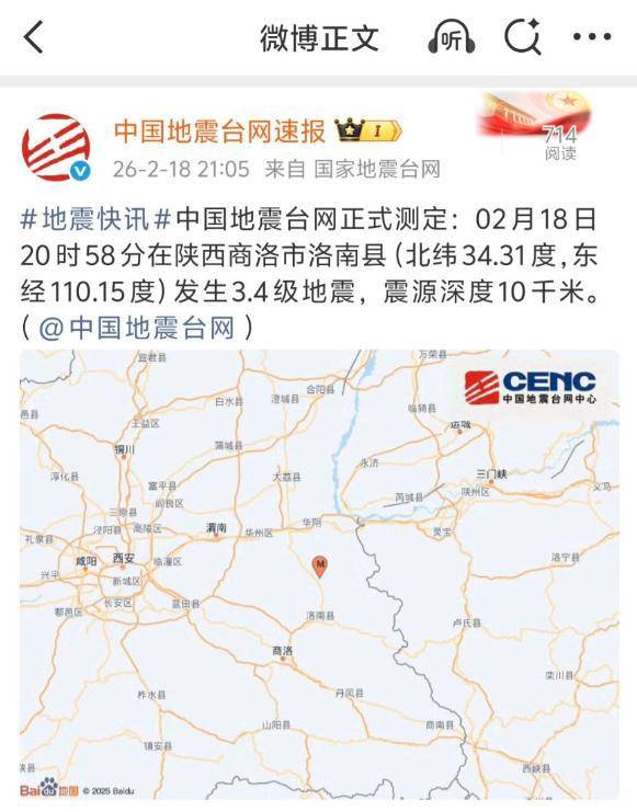 据中国地震台网正式测定,2月18日20时58分在陕西商洛市洛南县(北纬34.31度,东经110.15度)发生3.4级地震,震源深度10千米。