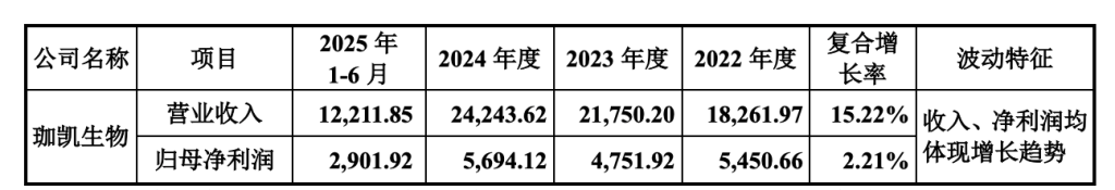数据显示,2022年至2024年及2025年6月末,珈凯生物营业收入分别为18261.97万元、21750.20万元、24243.62万元及12211.85万元。2023年度、2024年度及2025年上半年营业收入分别较上年同期增长了19.10%、11.46%及12.28%,销售收入呈不断增长态势。