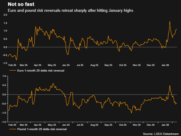 根据CME Group的数据,1月的货币期权数据显示,交易者购买了对冲,以防美元进一步下跌,并且对欧元持乐观态度。然而,数据显示,自凯文·沃什被提名领导美联储以来,对冲需求有所减弱,欧元和英镑的风险反转(衡量期权偏差)也自1月以来有所回落。