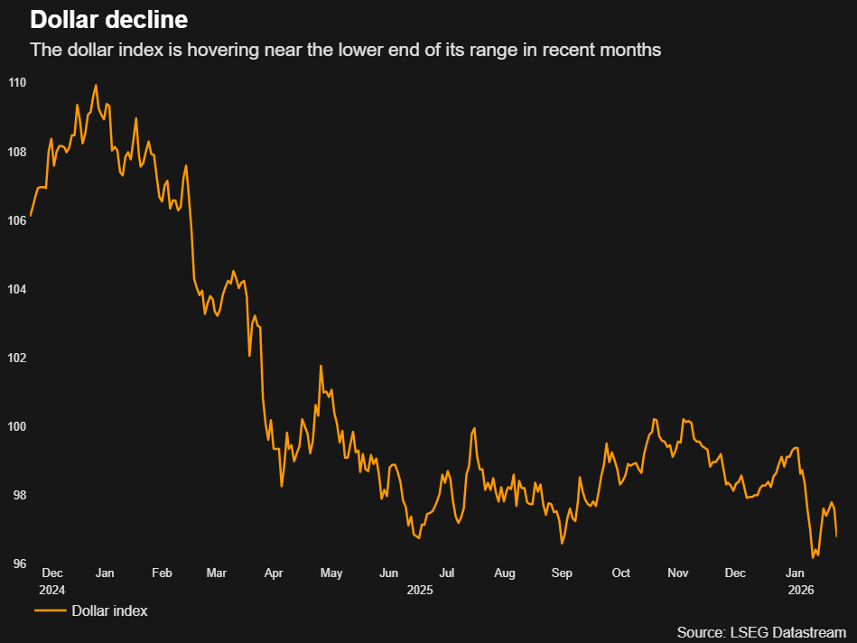 数据显示,衡量美元对六种主要贸易伙伴货币汇率的美元指数自去年11月以来一直低于100,自去年4月初所谓“解放日”以来已下跌6.7%,并在1月份跌至四年低点。