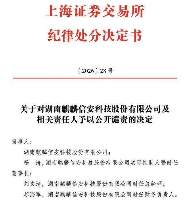 综上,上交所作出纪律处分决定:对湖南麒麟信安科技股份有限公司、杨涛、刘文清、苏海军予以公开谴责。