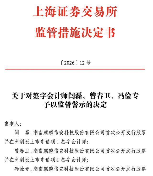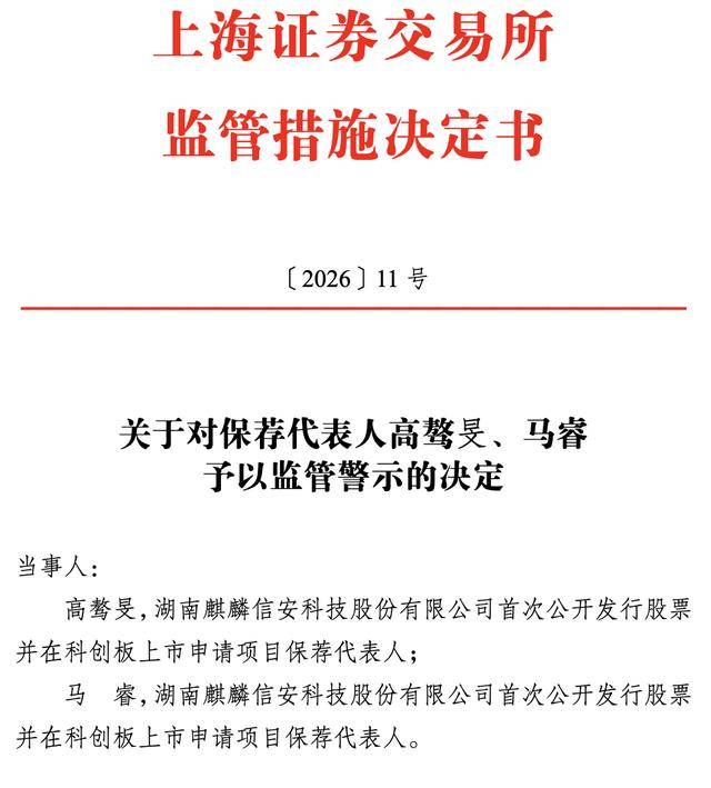近日,上海证券交易所发布纪律处分决定书,对湖南麒麟信安科技股份有限公司(简称“麒麟信安”)及其实际控制人杨涛、时任总经理刘文清、时任财务负责人苏海军予以公开谴责。