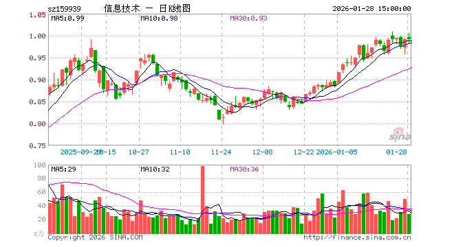 1月28日,信息技术ETF(159939)涨0.10%,成交额2769.99万元。当日份额减少400.00万份,最新份额为13.06亿份,近20个交易日份额减少1.32亿份。最新资产净值计算值为12.95亿元。