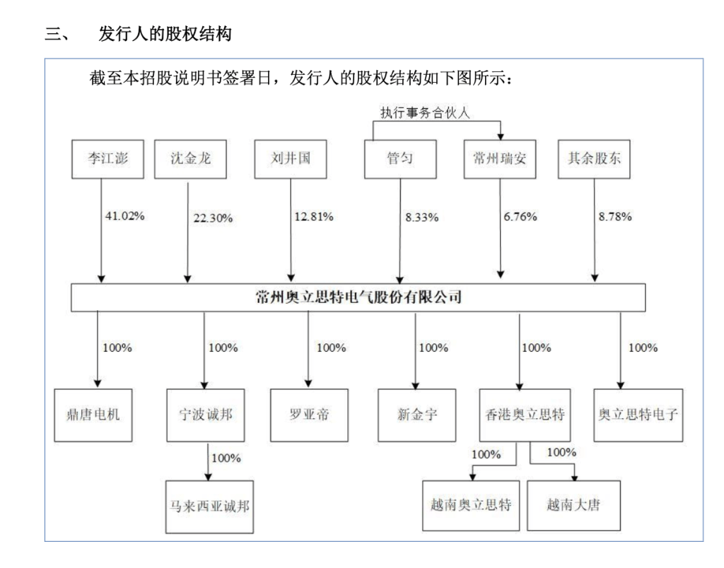 出生于1968年3月的李江澎为奥立思特控股股东、实际控制人,李江澎的女儿李子馨为其一致行动人。根据招股说明书,李江澎直接持有奥立思特38138081股股份,占发行前总股本的41.02%,系公司第一大股东;通过常州瑞安间接持有奥立思特558070股,占发行前总股本的0.60%。一致行动人李子馨直接持有奥立思特777200股股份,占发行前总股本的0.84%。李江澎及其一致行动人合计直接持有奥立思特41.85%股份。