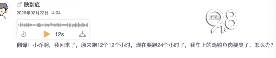 今天下午14:00多,杭州交通91.8《幸福加“马”,自带光芒》的节目互动区,吧友“耿到底”爆料说:原本12个小时的路程,要开24个小时了。杭帮侠记者采访了解到,发帖人是曹先生,他年前自驾从杭州开到湖南常德老家用了12个小时。为了避开返程拥堵,今天特意凌晨3点半就从湖南启程出发了,原以为天黑前能赶到杭州,但不曾想,下午2点多仍堵在湖北境内高速上。