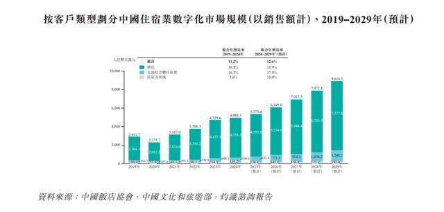 招股书显示,全球住宿业数字化市场规模由2019年约币388亿元增长至2024年约640亿元,2019–2024复合年增长率为10.6%,随著全球住宿业市场规模加速发展以及数字化支出占营收比重的持续提升,预计全球住宿业数字化市场规模将于2029年达到约1110亿元,2024–2029复合年增长率为11.6%。