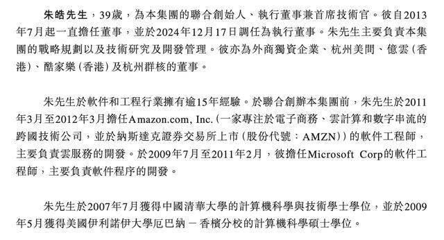 朱皓,39岁,为集团的联合创始人、执行董事兼首席技术官。其自2013年7月起一直担任董事,并于2024年12月17日调任为执行董事。朱皓主要负责集团的战略规划以及技术研究及开发管理。其亦为外商独资企业、杭州美间、亿云(香港)、酷家乐(香港)及杭州群核的董事。