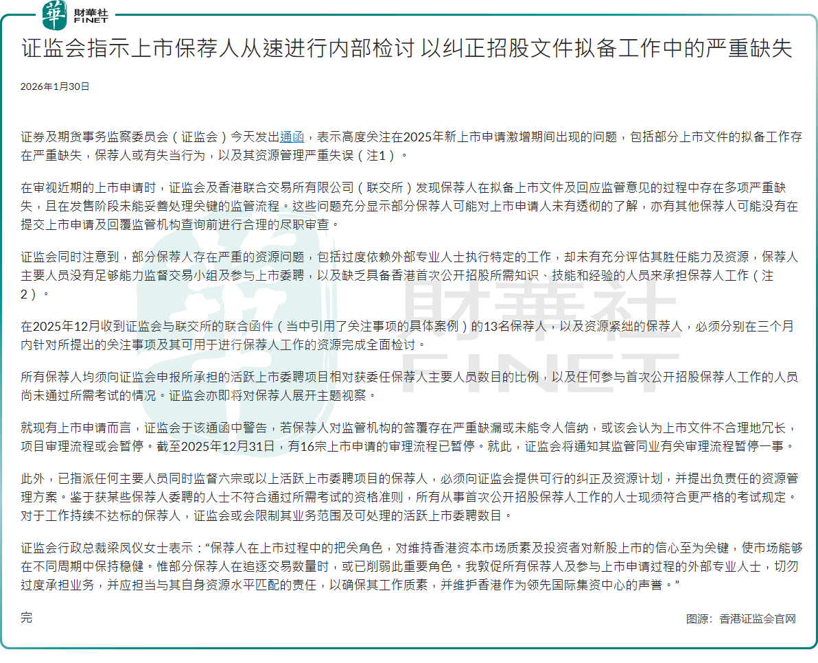 事实上,港交所早已通过实际行动筑牢质量防线,从源头杜绝劣质企业入场。针对2025年港股新上市申请激增期间暴露的保荐人履职失当、上市文件质量欠佳等问题,香港证监会今年1月底发布通函,明确要求相关保荐机构从速开展全面内部检讨,强化资源管理与合规管控,同时宣布截至2025年12月31日已有16宗上市申请审理流程暂停。