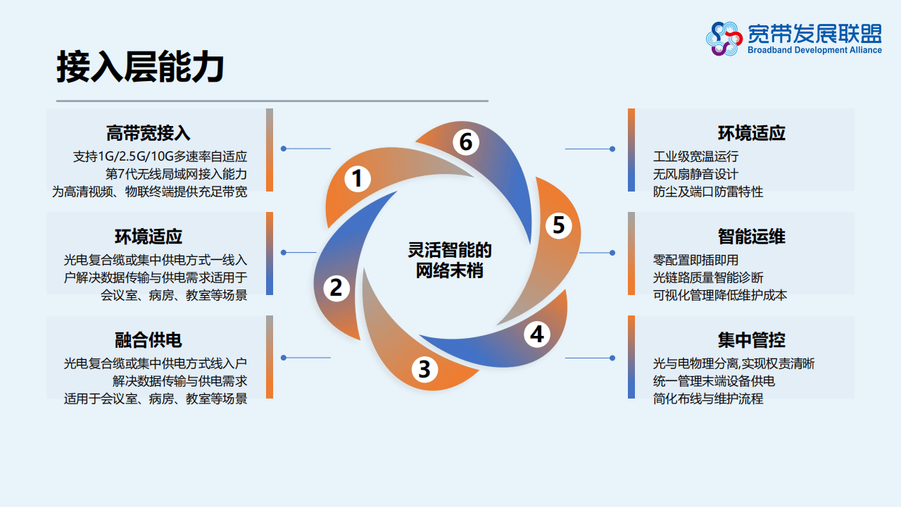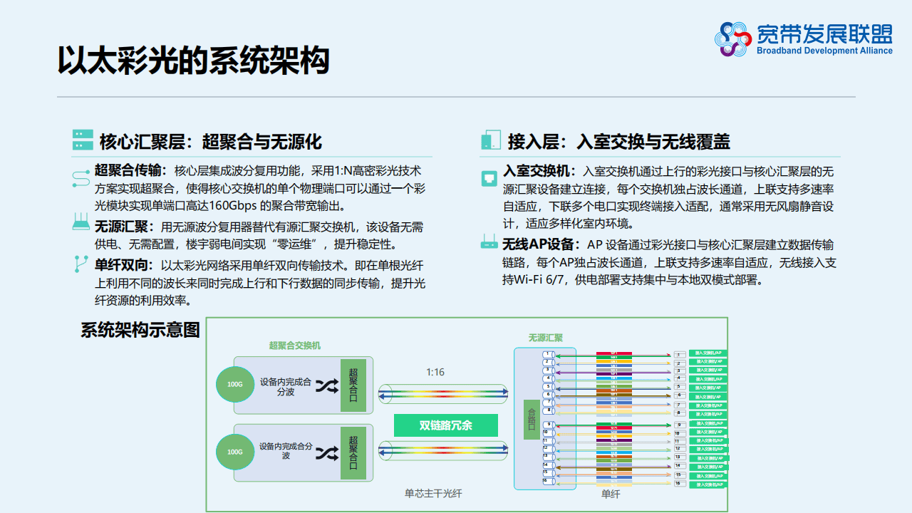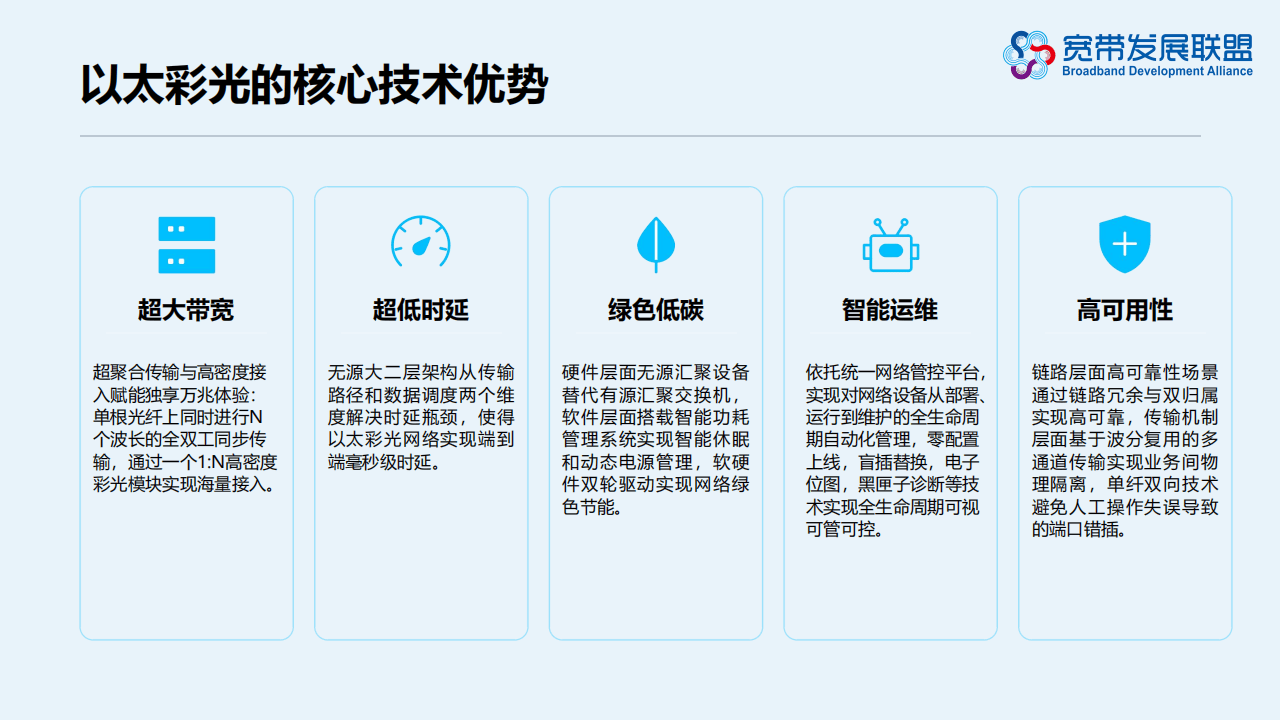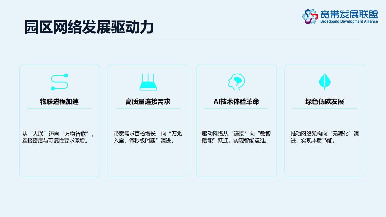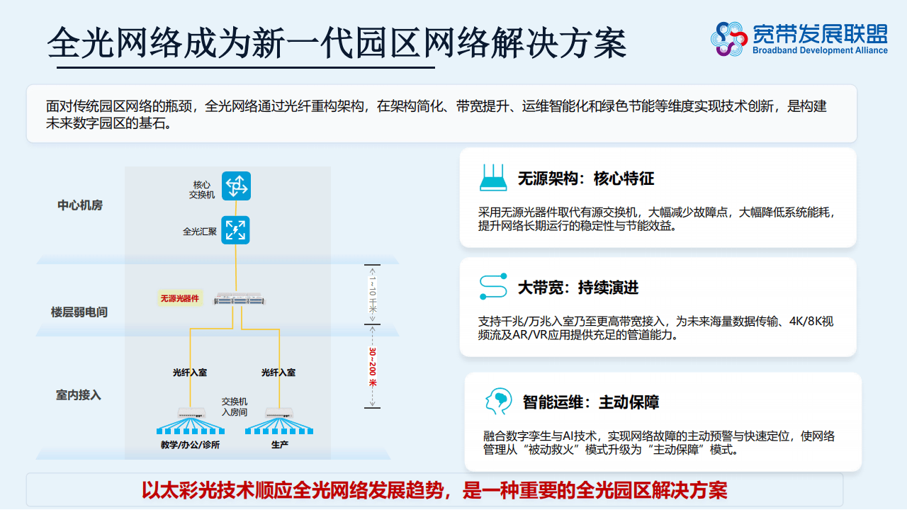 宽带发展联盟《万兆园区以太彩光研究报告》围绕构建高速、智能、绿色的下一代园区网络展开解读,指出物联进程加速、高质量连接需求提升、AI技术革新及绿色低碳发展,推动园区网络向万兆入室、微秒级时延、数智赋能和无源化演进,而传统园区网络存在业务扩展慢、带宽瓶颈突出、运维难度大等痛点,全光网络成为新一代解决方案,以太彩光技术则是其中的重要方向。
