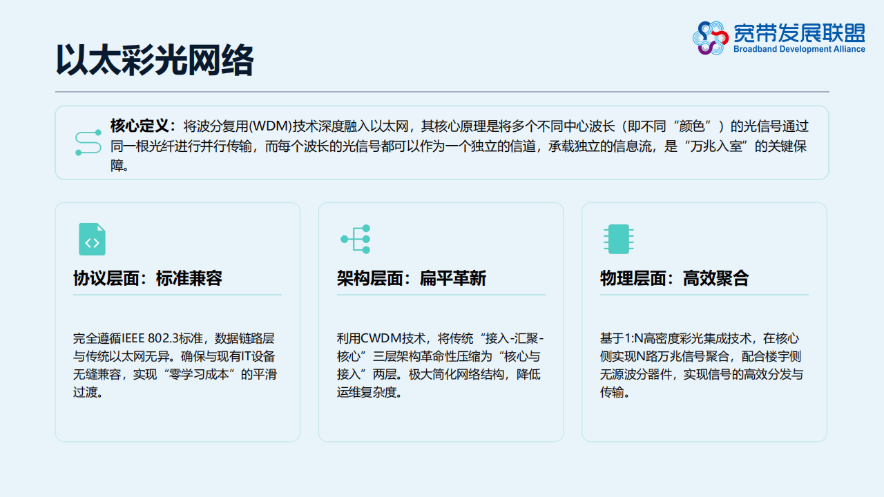 以太彩光网络将波分复用技术融入以太网,通过不同波长光信号在单纤并行传输实现独立信道承载数据,是实现万兆入室的关键。其在协议上兼容IEEE 802.3标准,架构上压缩为核心与接入两层,物理层面实现高效聚合,系统架构分为核心汇聚层与接入层,核心层实现超聚合传输与无源汇聚,单端口聚合带宽可达160Gbps,接入层通过入室交换机和无线AP实现终端接入,且设备适配多样化室内环境。同时,该技术具备超大带宽、超低时延、绿色低碳、智能运维、高可用性等核心技术优势。