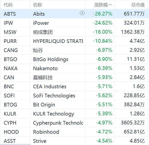 比特币一度跌破6.5万美元,美股市场加密货币概念股普跌。其中,Abits跌超26%,iPower跌超24%,明成集团跌16%,灿谷、BitGo Holdings、Nakamoto跌超6%,嘉楠科技、Bit Origin跌超5%,Robinhood、Strive跌超4%。