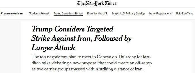 美国《纽约时报》当地时间周日报道称,了解政府内部讨论的人士透露,特朗普已告知顾问,假如外交手段或任何初步的针对性打击未能迫使伊朗放弃核计划,他将考虑在未来数月内发动一场旨在将伊朗领导人赶下台的更大规模攻击。