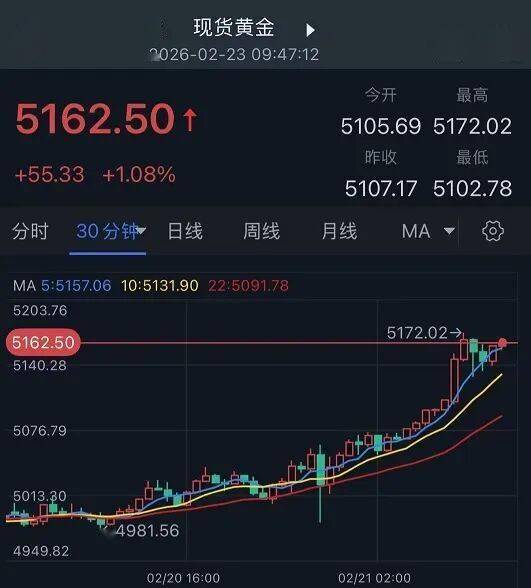 现货黄金价格周一盘中最高触及5172.02美元/盎司,日内飙升近65美元。