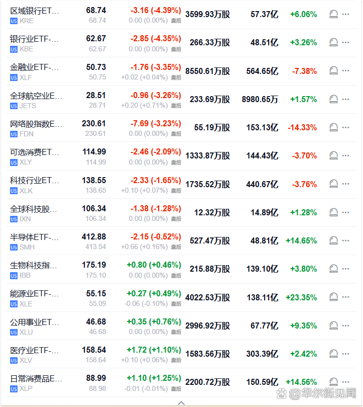 【区域银行ETF和银行业ETF收跌超4.3%,领跌美股行业ETF】周一(2月23日),区域银行ETF收跌4.39%,银行业ETF跌4.35%,金融业ETF跌3.35%,网络股指数ETF跌3.23%,科技行业ETF跌1.65%,全球科技股指数ETF跌1.28%,半导体ETF跌0.53%。