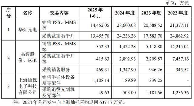 中图科技向华灿光电、晶智股份、EGK销售PSS、MMS等产品,同时向其采购蓝宝石平片等;向上海灿栎电子销售半导体设备及零配件,同时向其采购退役光刻机及零部件等。