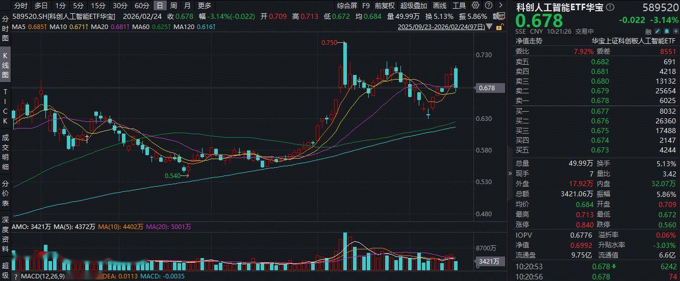 盘面上,春节后第一个交易日(2月24日),重点布局国产AI产业链的科创人工智能ETF(589520)或由于海外AI行情扰动,意外下跌,场内价格一度下探3.8%,现跌3.14%,场内频现溢价交易,或有资金逢跌抢筹!值得关注的是,节前最后一个交易日(2月13日)该ETF单日吸金843万元,或有资金看好国产AI后市表现,提前进场埋伏!