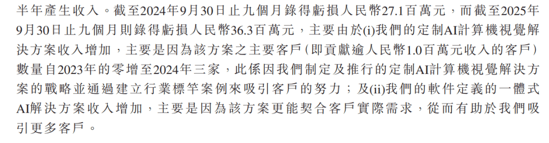 值得注意的是,极视角在招股书“概要”处分析历史财务资料时表示,公司2024年前三季度亏损2714.1万元,而2025年前三季度亏损3629.6万元,主要由于公司定制AI计算机视觉解决方案主要客户数量增加带来该业务收入增加,以及公司软件定义的一体式AI解决方案更能契合客户实际需求因而收入增加。
