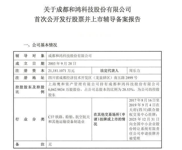 瑞财经 刘治颖 2月13日,成都和鸿科技股份有限公司(以下简称:和鸿科技)在四川证监局完成IPO辅导备案,拟A股上市,辅导机构为长江证券承销保荐有限公司。