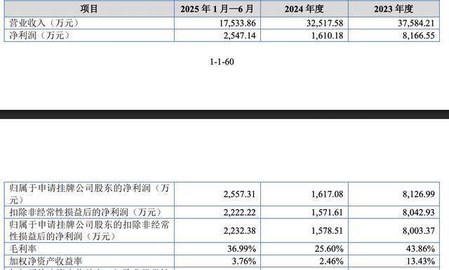 2023年、2024年及2025年上半年,和鸿科技营业收入分别为3.76亿元、3.25亿元、1.75亿元,净利润分别为8166.55万元、1610.18万元、2547.14万元,毛利率分别为43.86%、25.6%、36.99%。