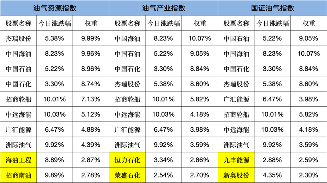 从前十大重仓股看,A股的三个油气指数前十大重仓股中,有8只相同,但权重有所差异,有2只重仓股不同。