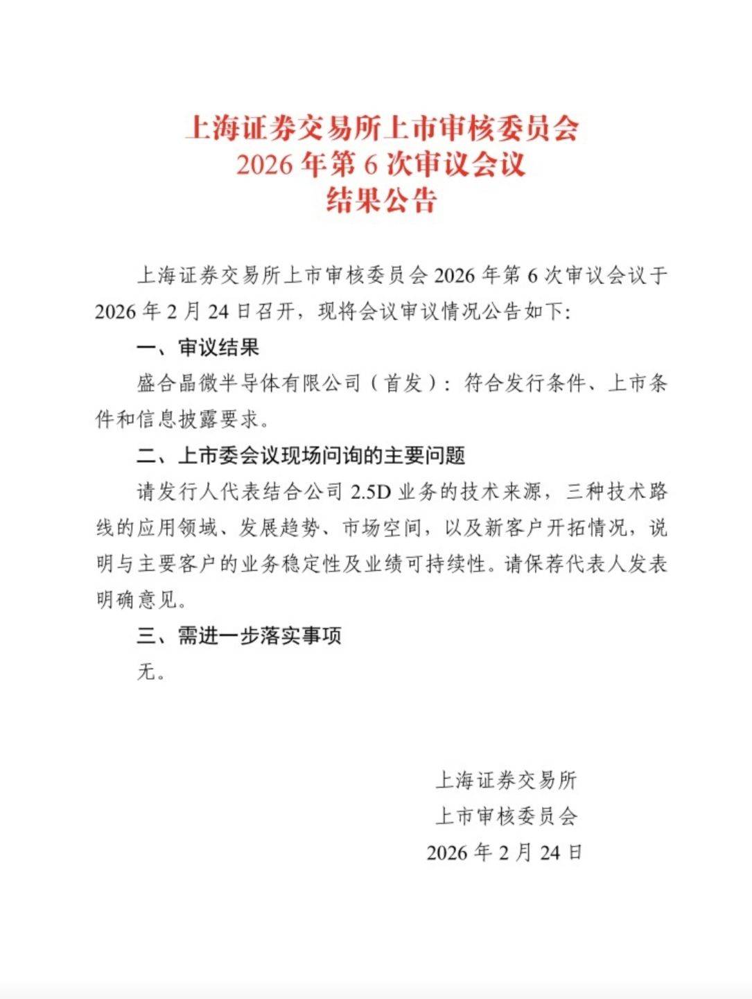 2月24日,上海证券交易所上市审核委员会2026年第6次审议会议召开,审议结果显示,盛合晶微半导体有限公司(以下简称“盛合晶微”)科创板IPO申请“符合发行条件、上市条件和信息披露要求”。