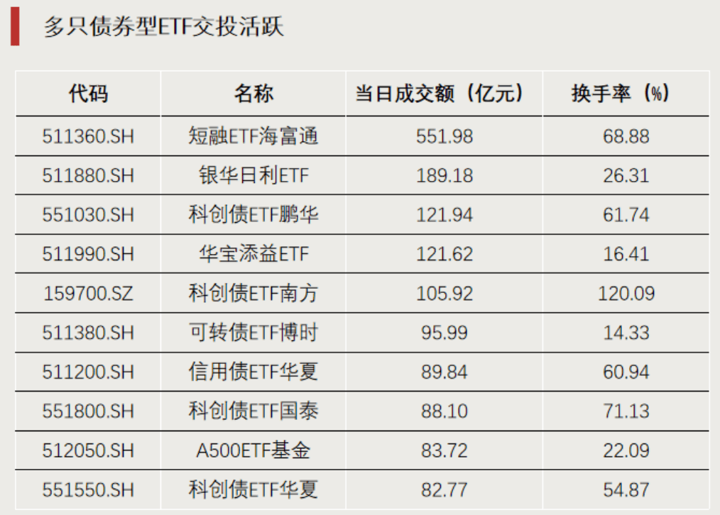 2月24日,债券型ETF交投活跃,短融ETF海富通(511360)成交额超过550亿元,多只科创债ETF成交额位居前列。