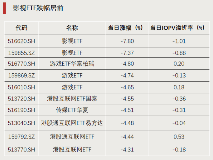 影视ETF(516620)、影视ETF(159855)今日均跌超7%;多只游戏主题ETF和港股互联网主题ETF跌幅居前。