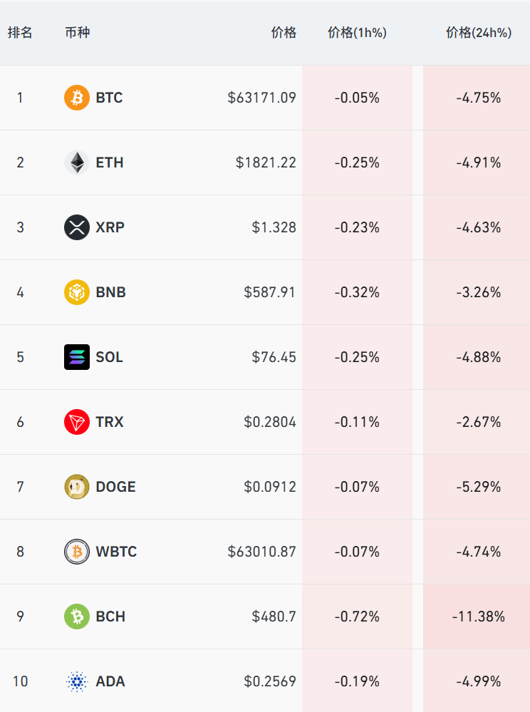 主流币种方面,过去24小时,BCH跌超11%,ETH、BNB、DOGE等均有明显跌幅。