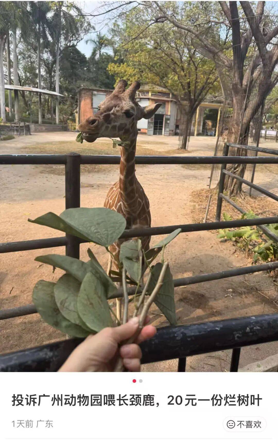 近日,有网友发帖吐槽,在广州动物园体验投喂长颈鹿时,花费20元仅买到一份品相不佳的树叶,配图显示只有三根带叶的细小树枝。