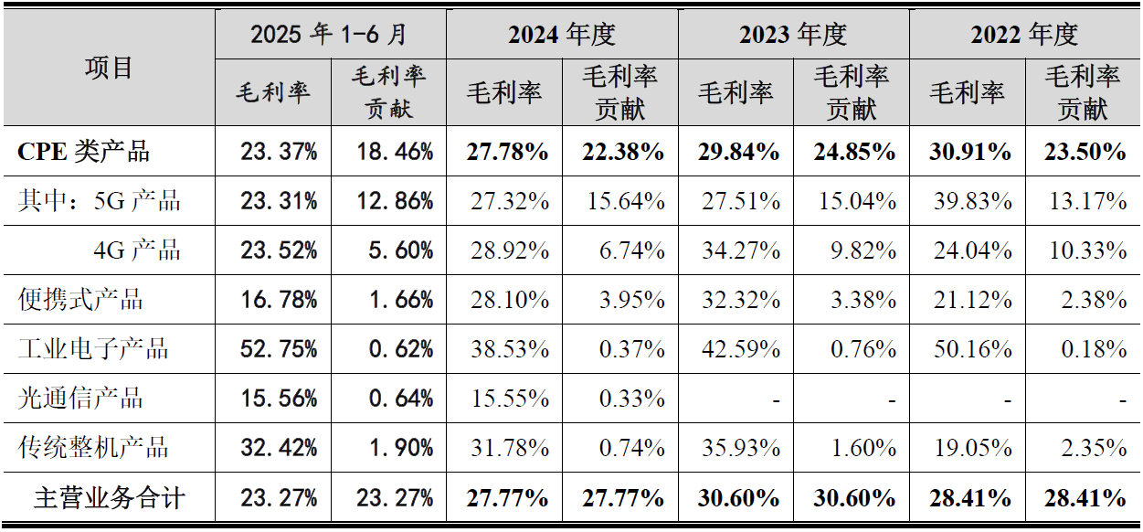 财报数据清晰显示了5G CPE业务的盈利能力恶化趋势:2022年,该产品毛利率高达39.83%,处于行业较好水平;但2023年出现断崖式下滑,降至27.51%,同比下降12.32个百分点;2024年毛利率微降至27.32%,2025年上半年进一步下滑至23.31%,三年半时间累计降幅超16个百分点,