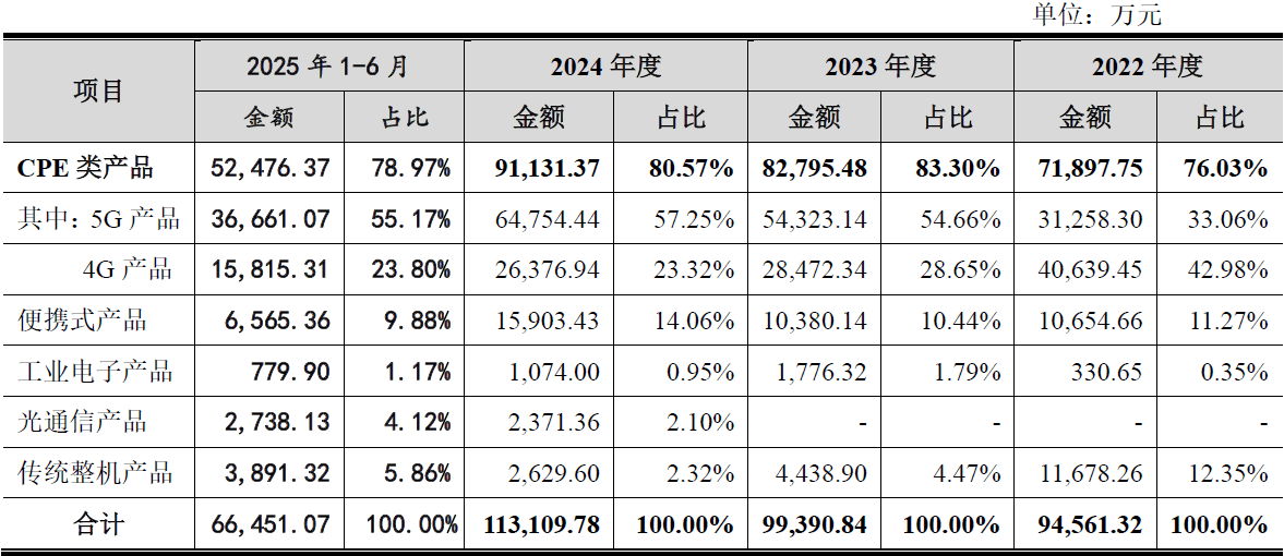 通则康威的核心业务聚焦于自主型号系列宽带连接终端设备,产品矩阵涵盖5G和4G CPE类产品、便携式产品、工业电子产品、光通信产品及传统整机产品,其中CPE类产品(无线终端接入设备)是绝对的收入主力——随着5G技术的普及,5G类CPE产品收入占比逐年上升,4G类CPE产品占比则持续下降,业务结构看似贴合行业趋势。