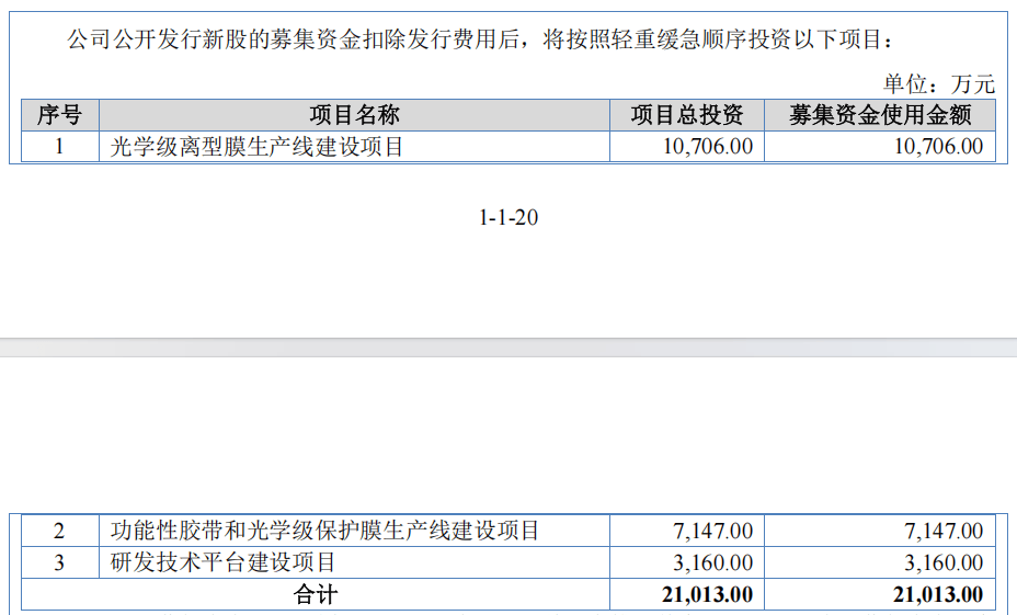 羽玺新材表示,募集资金最大投向为“光学级离型膜生产线建设项目”,拟投入1.07亿元,占募资总额的50%以上。该项目计划新增年产能约1.2亿平方米光学级离型膜。