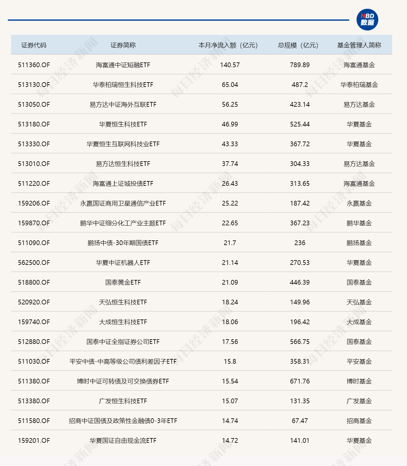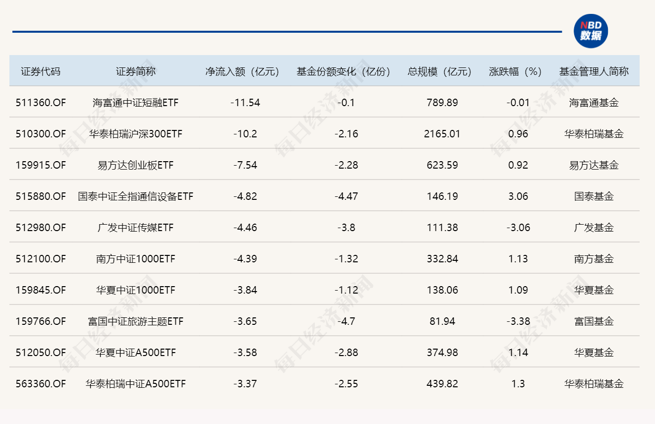 与此同时,海富通中证短融ETF基金份额减少0.10亿份,净流出额11.54亿元;华泰柏瑞沪深300ETF基金份额减少2.16亿份,净流出额10.20亿元;易方达创业板ETF基金份额减少2.28亿份,净流出额7.54亿元。