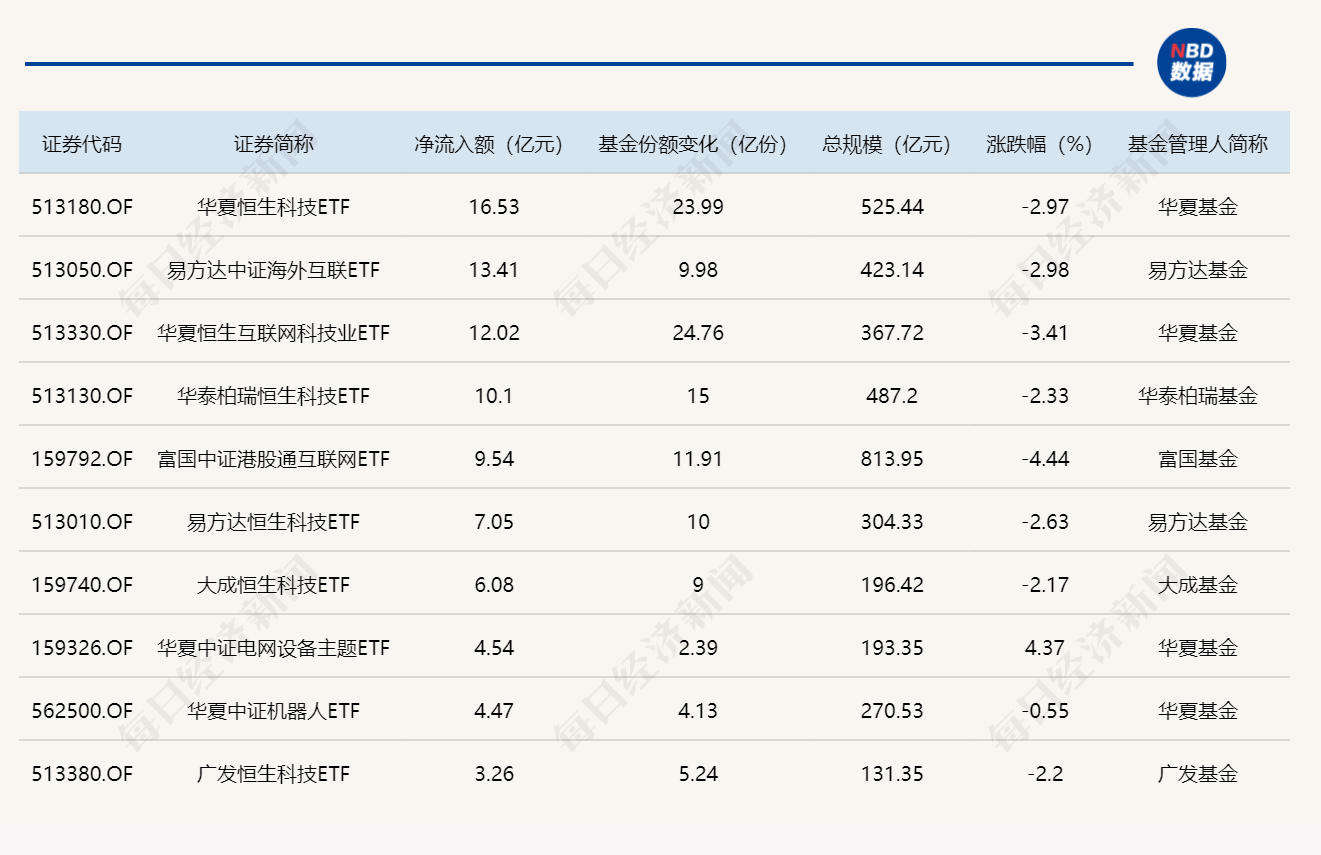 Wind数据显示,在2月24日的非货币ETF市场中,华夏恒生科技ETF基金份额增加23.99亿份,净流入额16.53亿元;易方达中证海外互联ETF基金份额增加9.98亿份,净流入额13.41亿元;华夏恒生互联网科技业ETF基金份额增加24.76亿份,净流入额12.02亿元。