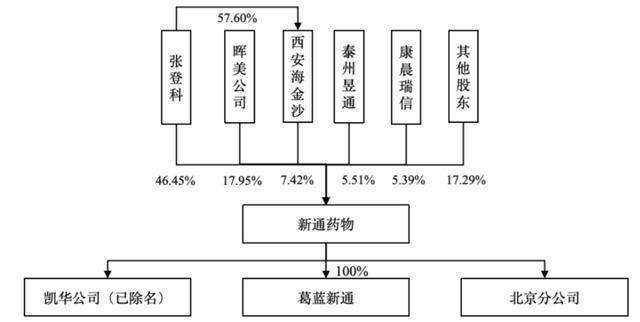 递表前,张登科直接持有新通药物46.45%股权,并通过西安海金沙间接控制公司7.42%股份,合计控制公司53.86%股份,为公司控股股东、实际控制人。