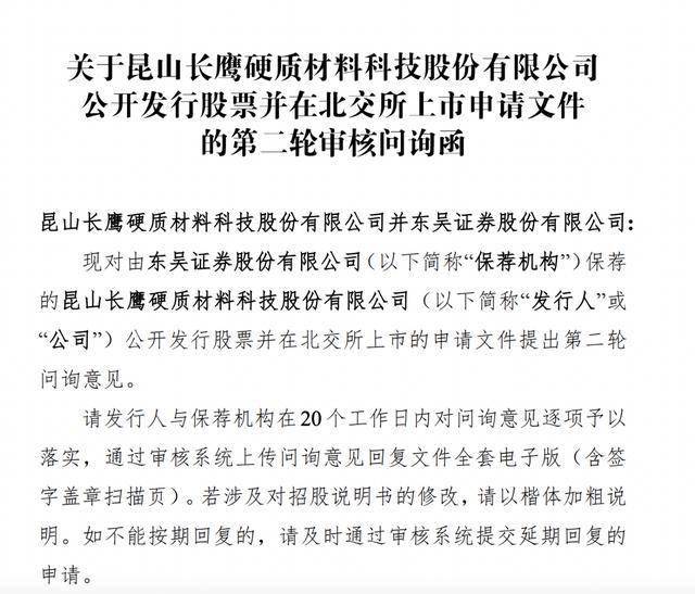 瑞财经 刘治颖 2月12日,昆山长鹰硬质材料科技股份有限公司(以下简称:长鹰硬科)披露第二轮审核问询函,拟北交所上市,保荐机构为东吴证券,保荐代表人为孙骏可、周添,会计师事务所为立信。